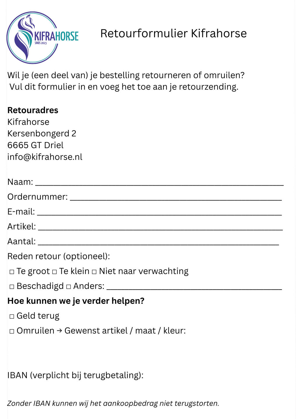 Ben je niet helemaal tevreden over je aankoop? Geen probleem. Bij Kifrahorse heb je het recht om je bestelling tot 14 dagen na ontvangst zonder opgave van reden te annuleren. Na annulering heb je nogmaals 14 dagen om het product naar ons terug te sturen.